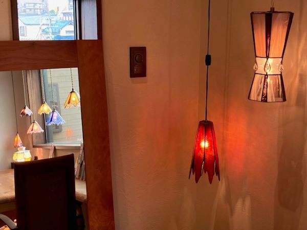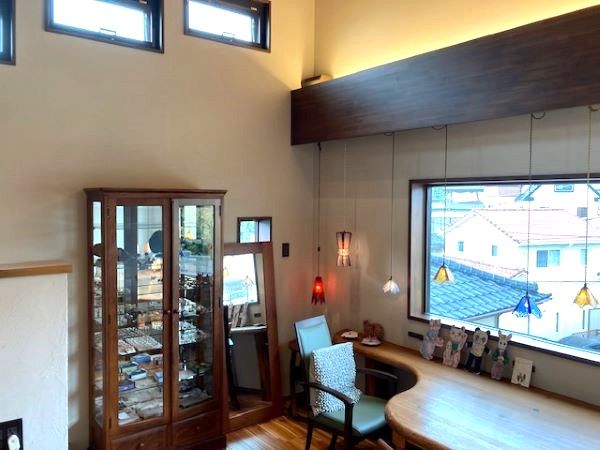 1階にも飾ってありましたがこちらにかけてあるランプは、オーナーでランプデザイナーの慧さんの作品です。ジュエリーなどのデザイナーをされている奥様のまゆみさんがランプの傘をデザインされることもあるそうで、ご夫婦で一つの作品を作り上げるって、とても素敵ですよね(^^♪ フランスにいらしたこともある慧さんによると、フランスの家庭から漏れてくる明かりはこちらのランプのように暖かい暖色系の灯りがほとんどで、蛍光灯の明かりが多い日本とは違いとても雰囲気があったそうです。ランプの灯りって本当に落ち着きますよね~! 取材中に2階でお話をさせていただいたのですが、とてもゆったりとした穏やかな時間を過ごさせていただきました。 商品を見るのに夢中になったお客さま達が、よくこちらで休憩をかねてどの商品にするか悩んだり、商品について語りあったりされているそうです。