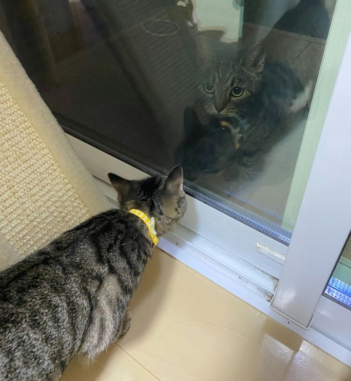 しかし、よく見るとガラスには愛猫とは違う猫の姿が。「あれ?これは向こうに実在してる?しかもこっちを見ている!」数秒の間に忙しく思考がめぐりそうな状況です。つい「…え、誰?」と呟きたくなる気持ちも分かりますね。