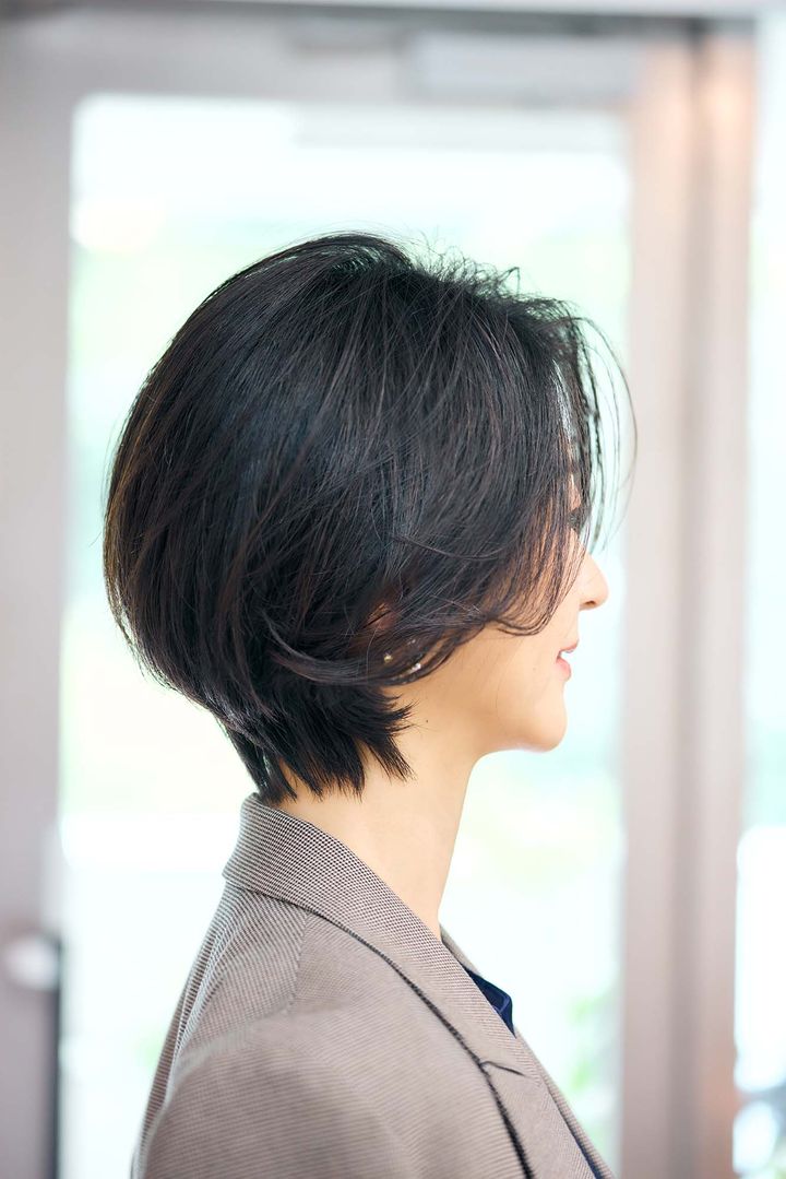 【ご本人感想】いつもボブくらいの短めのスタイルですが、ここまで短いのは新鮮です。クセや乾燥もあり、あまり短すぎると広がってしまうのではないかと思っていましたが、計算されたカットでむしろ時短が叶いスッキリ! 顔が小さく見えて服とのバランスも取りやすくなり、オシャレ感がでて大満足です。