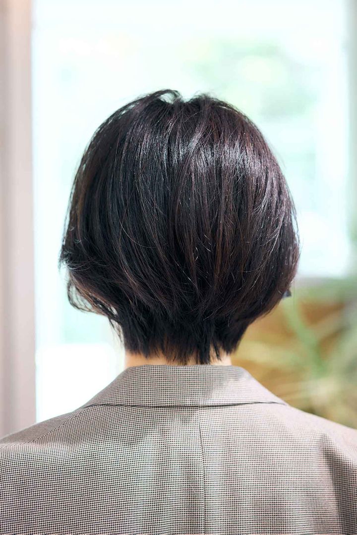 【ご本人感想】ずっと憧れていた短いヘアスタイルは15年振りで感動!襟足が浮いてしまう生え癖があり、短い髪型に憧れはあれど自分とは無縁の髪型だと思っていました。ショートボブはとにかくシャンプーやドライヤーが楽すぎて、もう元には戻れないかも(笑)。夫は初めて見た私の短いヘアスタイルに喜び「めちゃくちゃ似合ってる!良いね」と誉めてくれました。