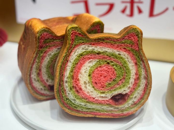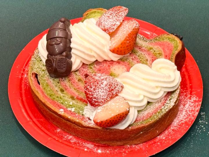 「ねこねこ食パン ホリデイサンタ」は、プレーン、ピスタチオ、いちご、3種類の素材を渦巻き状に焼き上げた猫型食パン。アクセントに、いちごチョコを生地に混ぜあわせています。色あいでクリスマス感を演出し、ほかにないビジュアルにテンションが上がります!