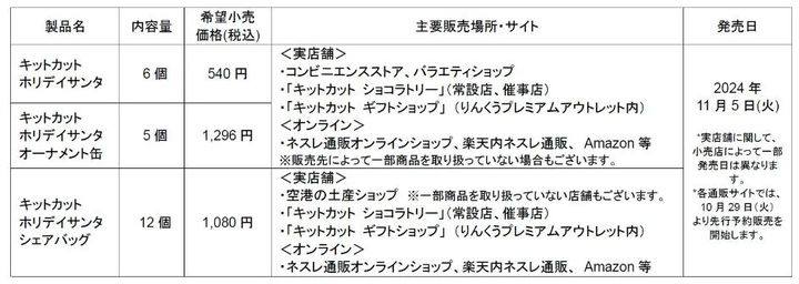2024年の「キットカット ホリデイサンタ」のラインナップは全3種類。なお、外包や個数が異なるだけで、中身はすべて同じです。