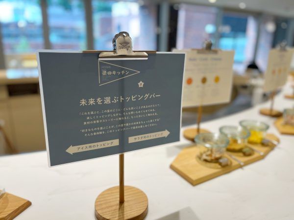 サラダやデザートを頼むと使える多彩なサステナブル食材を選び、食材の背景やストーリーに触れながら、サラダやアイスクリームをカスタマイズできる「未来をおいしく選ぶ“サステナブル・トッピングバー”」も楽しいですよ。