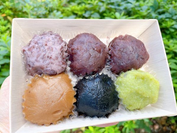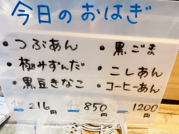 おはぎの値段は1個 216円、4個 850円、6個 1200円。昔ながらのおはぎよりやや小ぶりなので、いろいろな味を楽しめます。内容は季節や日によって変わります。自分と家族に6個購入しました。