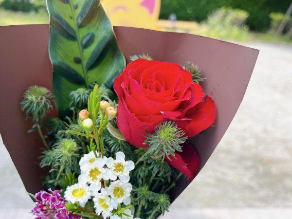 お会計の後にオープン記念のミニブーケをいただくと「最後にお花を渡すと皆さん一番の笑顔になります」とおっしゃられ、自分自身が喜んでいるのに気がつきました。お客様の笑顔が嬉しそうな奥様もまた印象的でありました。