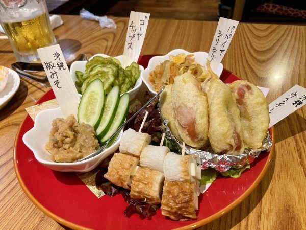 ちくわチーズ、沖縄豚みそ、ゴーヤチップスにパパイヤシリシリ、そして沖縄ウインナー天の5品。