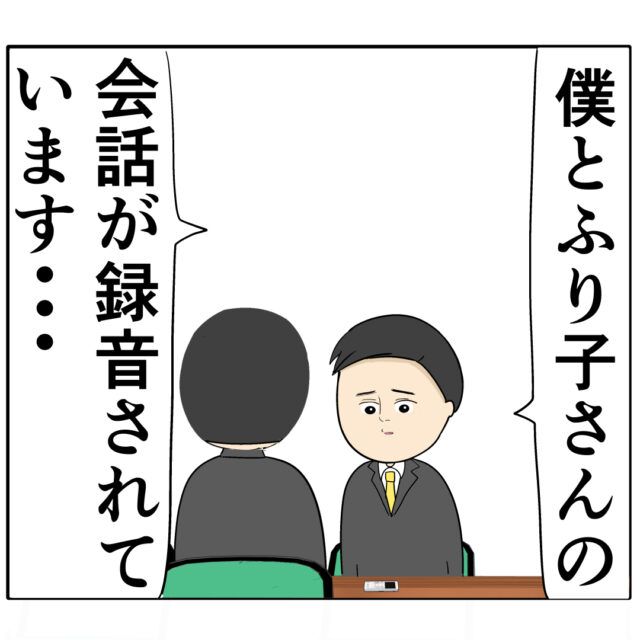 自分に振り向かなかったことへの腹いせにセクハラ、パワハラをでっちあげた後輩女性のふり子さんと、部長と課長を交えて面談をする良し男さん。良し男さんが和解を持ちかけても「私はセクハラ、パワハラをされました。自分のした事を認めて下さい」と折れないふり子さん。家族のためにも潔白を証明したい良し男さんはハラスメントをきっぱり否定し、「これが証拠です」と言ってボイスレコーダーを取り出しました。