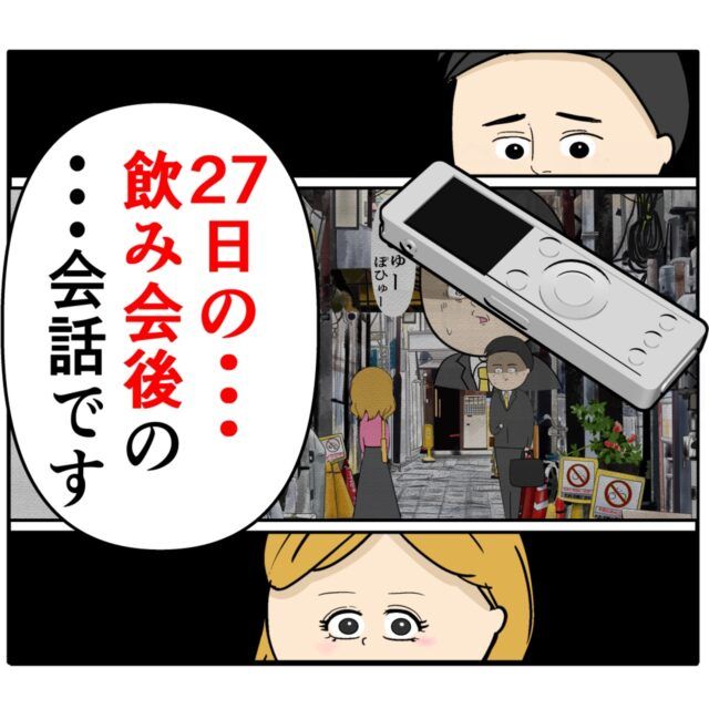 「27日の・・・飲み会後の・・・会話です」良し男さんは録音されている内容を言いづらそうに部長に説明しました。