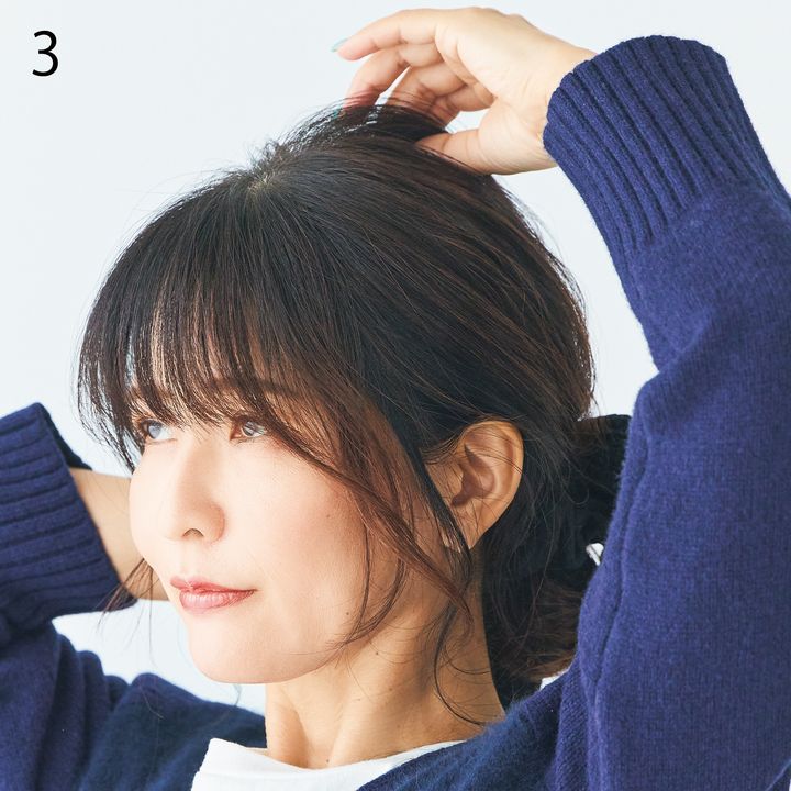 3.結び目を手で押さえながら、トップの髪を軽く引き出して高さをプラスします。