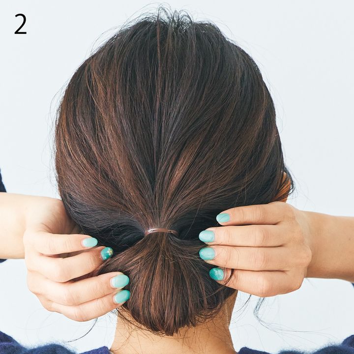 2.シニヨンにした髪を左右に広げてボリュームを出します。シュシュをかぶせてさらにかさ増し。