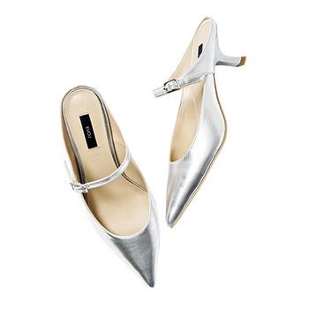 シルバーミュール(5.5)/EVOL 冷静なシルバーが似合う細身。くびれたヒールで後ろ姿までスタイリッシュさをキープ。甲のベルトが甲浅な形を安定させる。