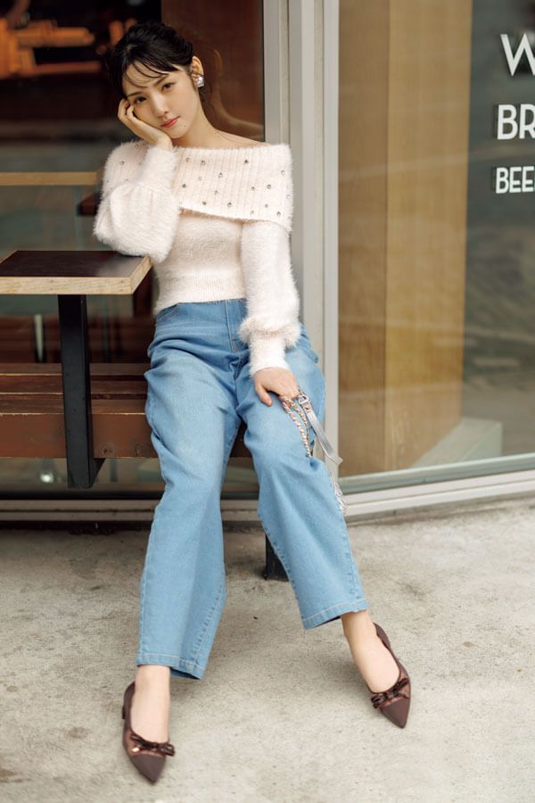オフショル、シャギー素材、ビジュー……etc.大人女子好みのトレンド要素を1枚にぎゅっと凝縮。スカートではなく、デニムパンツでラフにはずすことでこなれた印象に。
