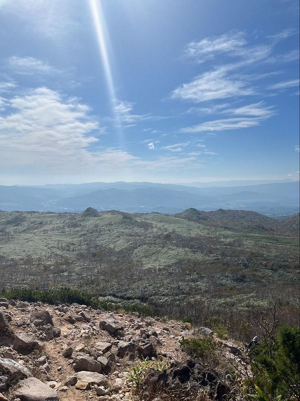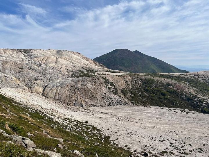 イワオヌプリは火山で、山頂付近の白色化した景色が特徴的です。