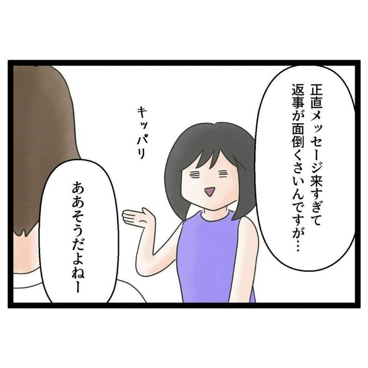 良好な関係だからこそ、なのかもしれませんがそれでも一日に度もたあいもないメッセージが届いたら、返答に困ってしまいますよね。サマ子さんは連投されるメッセージの対応に困り、夫に相談。まとめて返すという作戦を立てます。無視はせず、だけど自分のペースは保つ、という賢い方法ですよね。