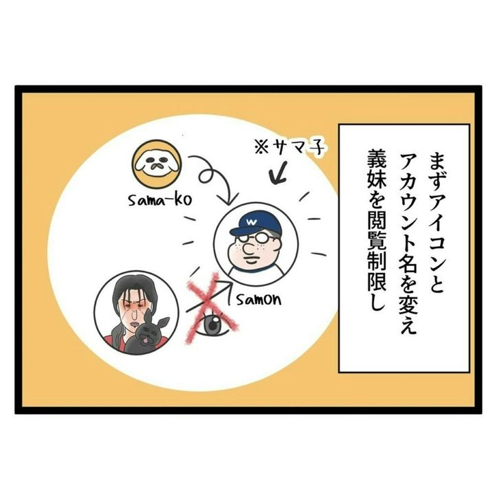 サマ子さんはアカウントをこっそり変えて、別人に成りすまし、親戚の閲覧制限をかける、という方法をも思いつきます。こっそり別のアカウントをつけたり、アカウント名を特定されないようにしたり、お互いが嫌な思いをしない方法がきっとあるはずです。SNSも立派なコミュニケーションツール。上手に付き合っていく工夫をしてみるといいですよね。