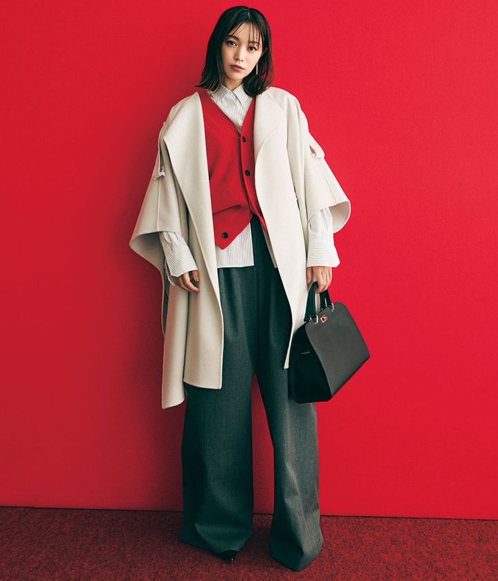 コート¥143,000(ebure/リトルリーグ インク)ニットベスト¥19,800(マカフィー/トゥモローランド)シャツ¥25,300(ユナイテッドアローズ/ユナイテッドアローズ 丸の内店)パンツ¥88,000(エストネーション)バッグ¥188,980(ミチノ パリ/トゥモローランド)パンプス¥35,200(ピッピシック/ベイジュ)ピアス¥59,400※片耳価格(オー/ハルミ ショールーム)