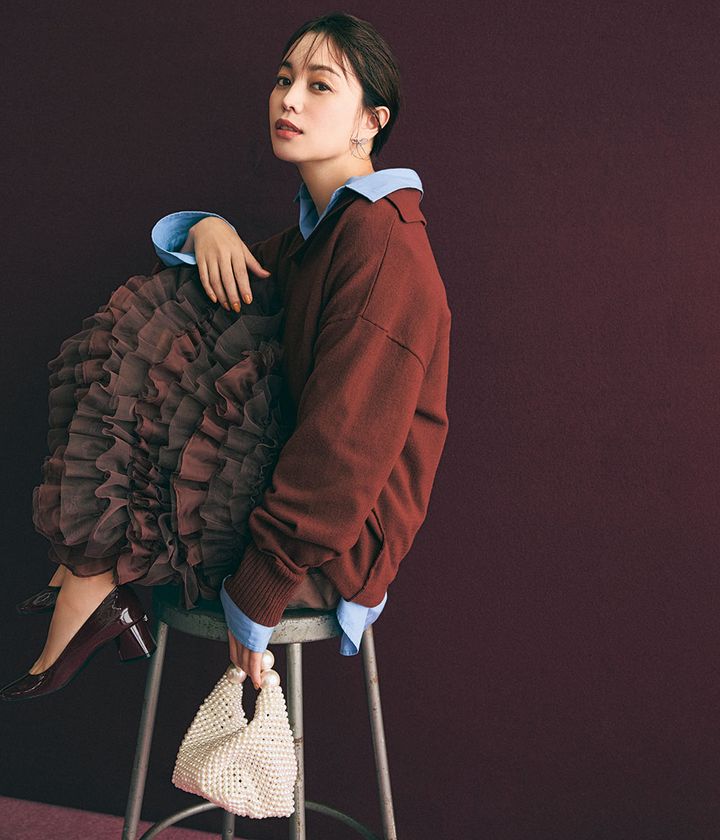 ニット¥29,700(アストラット/ATTISESSION 新宿店)チュールワンピース¥16,500(ラベルエチュード)シャツ¥34,100(シー/エスストア)バッグ¥85,800 (ヴァニーナ〈ルル・ウィルビー〉)ピアス¥15,400〈サスキアディツ〉ともにアルアバイル)シューズ¥135,300(セルジオ ロッシ/セルジオ ロッシ カスタマーサービス)