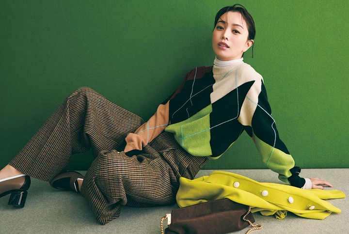 ニット¥53,900(ギャルリー・ヴィー/ギャルリー・ヴィー 丸の内店)タートルトップス¥12,100(アルアバイル)カーディガン¥38,500(スタンブリー/ヒューエルミュージアム)パンツ¥74,800(カレンテージ/メルローズ)バッグ¥75,900(マエストソ/アマン)シューズ¥183,700(ピエール アルディ/ピエール アルディ 東京)