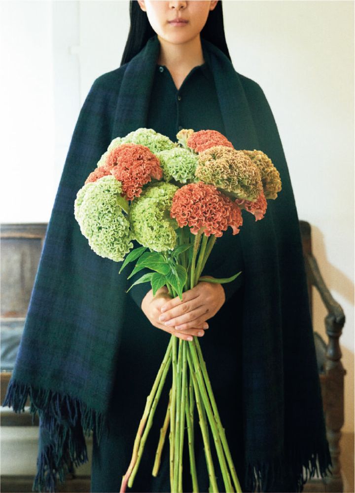 『ル・ベスべ』の松岡龍守さんが選んでくれた今月の花は、色とりどりのトサカケイトウ。グリーン、ベージュ、オレンジを一束にまとめ、徐々に色づく秋の木々を思わせるような色合いに。「波立つような花穂が集まって、球状に広がるこの品種。ビロードのような艶のある光沢にも色気を感じますね。茎がまっすぐで長いので、細長い花瓶に2、3本挿すだけでも様になりますし、短く切って口の広いピッチャーなどにラフに生けても迫力が出ます。部屋の雰囲気をぐっと華やかにしてくれますよ。飾った後にドライフラワーとしても楽し めます。ボリューミーなリースに仕立てるのもいいですね」(ル・ベスベ 03‒5469‒5438) ストール、ニットポロドレスはp.11で紹介。