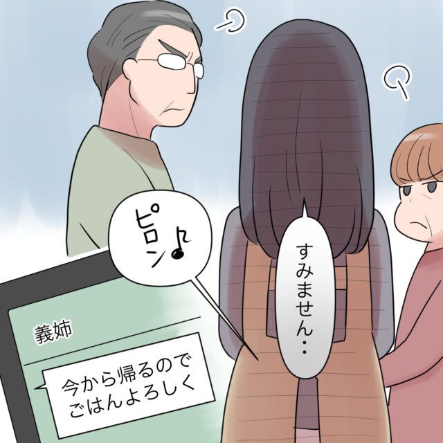 義両親から口々に不満を言われ、カエデさんは「すみません・・・」と謝ることしかできません。そのときピロンッとカエデさんのスマホが鳴りました。お義姉さんからの「今から帰るのでごはんよろしく」というメールでした。