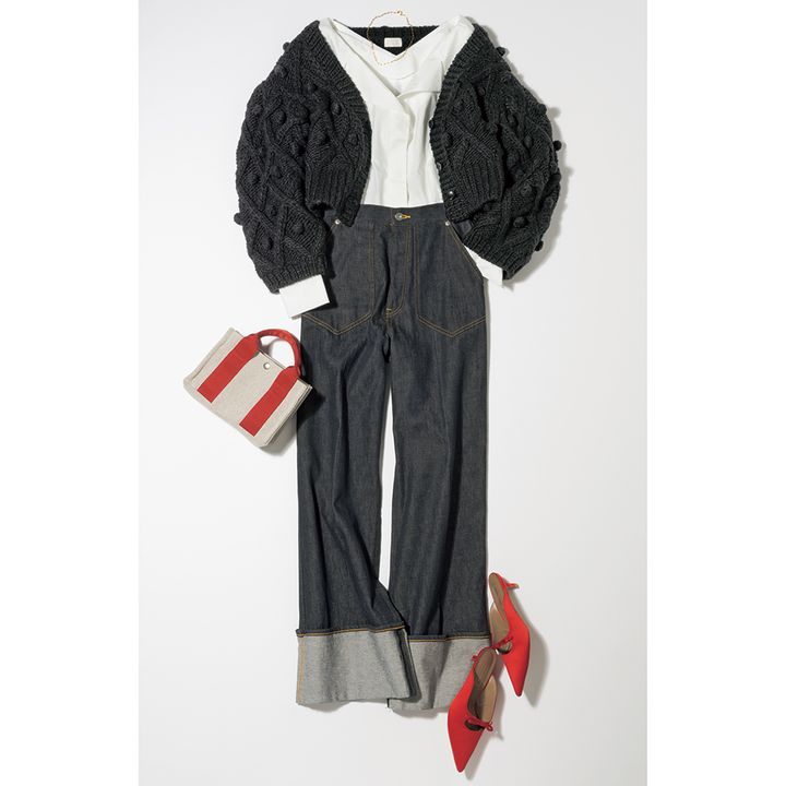 オープンブラウス¥27,000 手編みポンポンカーディガン¥36,000 デニム¥30,000(すべてシーニュ/シーニュ)バッグ¥30,250(フランソワ レニエ/ヤマニ) 靴、アクセサリー(スタイリスト私物)