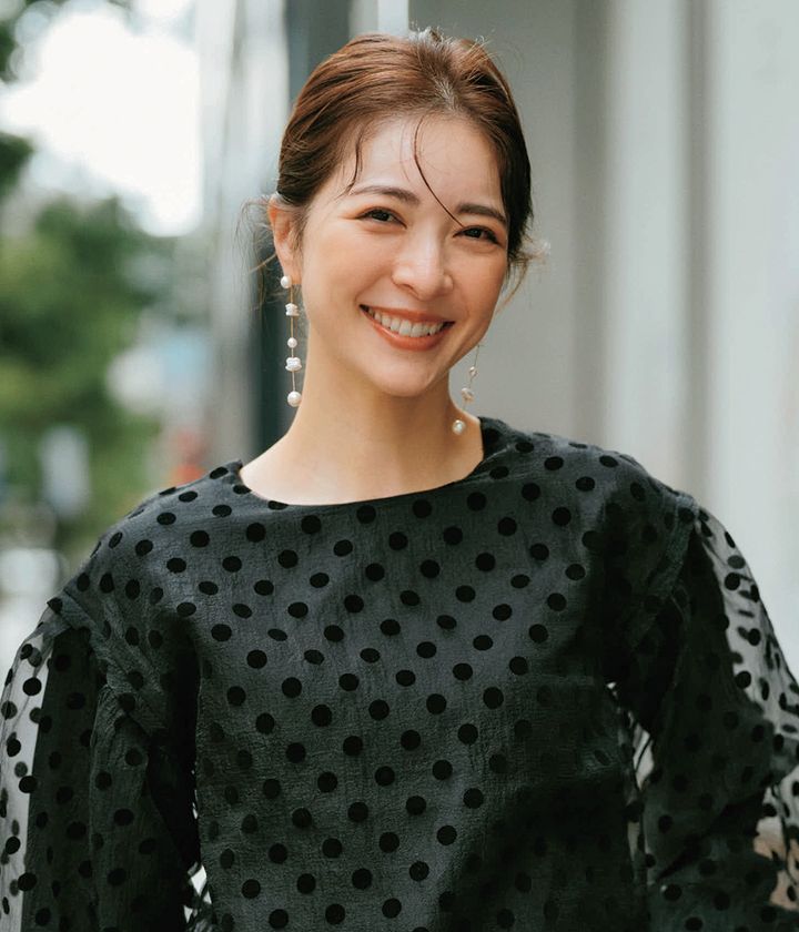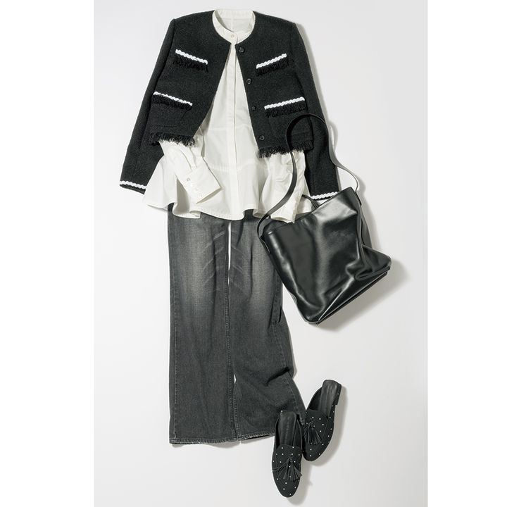 エレガントなお顔立ちにマッチするツイードジャケットをダメージ加工のブラックデニムでカジュアルダウン。インナーのペプラムブラウスで甘さをプラスしモノトーンだけど柔らかい印象に仕上げました。大容量のバッグとフラットシューズで動きやすさも重視。
