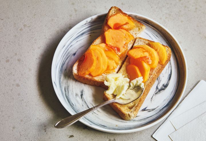 (2)食パンをオーブントースター(1000W)で2~3分こんがりと焼き、一度取り出す。片面にバター10gを等分に塗り、トースターに戻す。余熱でバターが溶けたら再度取り出し、柿を1/2量ずつのせる。好みでさらにバターを適宜のせる。