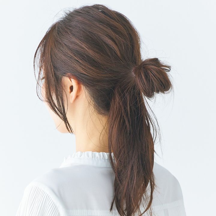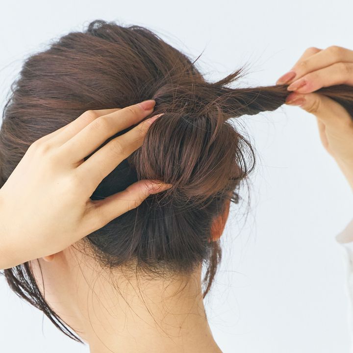 2.長く残した毛束を軽くねじります。ねじった毛束を根元に巻きつけ、毛先を根元のゴムに挟んで留めます。