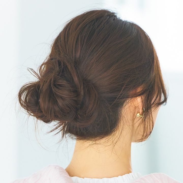 1.顔周りの髪を下ろしてから、残りの髪を耳の高さでゴムシニヨンにします。毛束を長く残したシニヨンにするのがコツ。