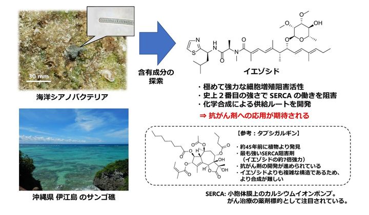 特に、海洋シアノバクテリアからは、極めて低濃度でがん細胞の増殖を抑える新しい化学物質イエゾシドが発見され、抗がん剤としての使用も検討されています。
