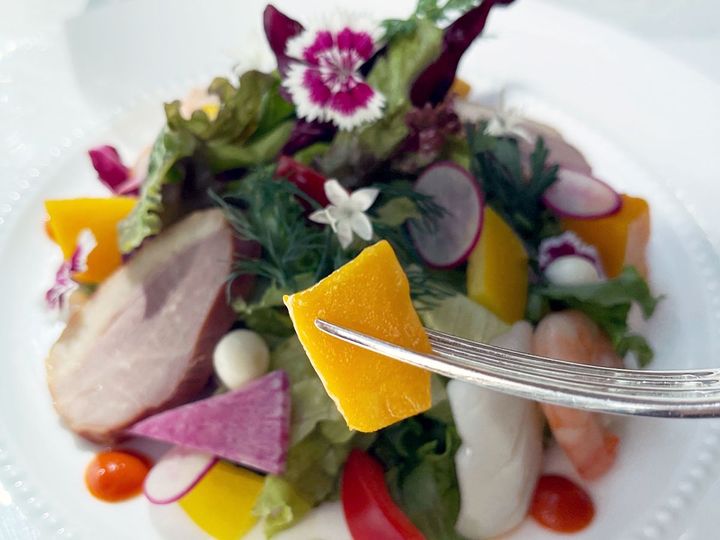エビやイカなどの海の幸のマリネに鴨のスモーク、野菜やマンゴーも使用されたボリューミーな一皿です。