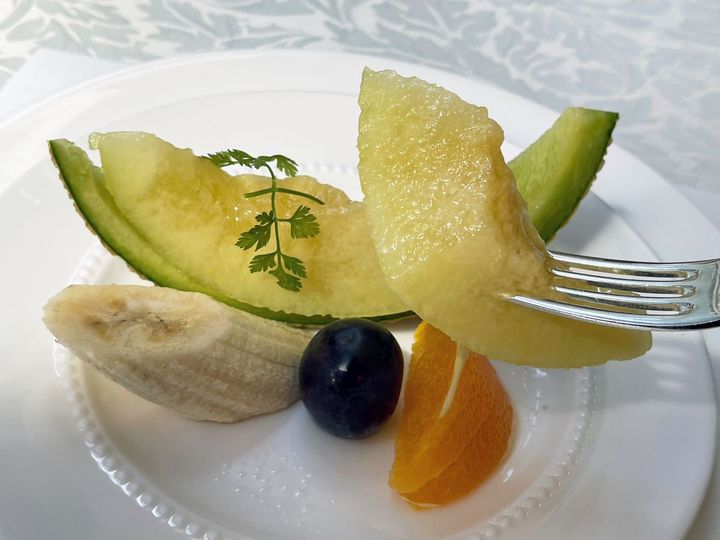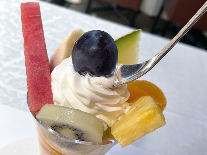 付け合わせのフルーツは季節によって変わるそうで、取材時(※2024年9月)はバナナとピオーネ、そしてオレンジでした。