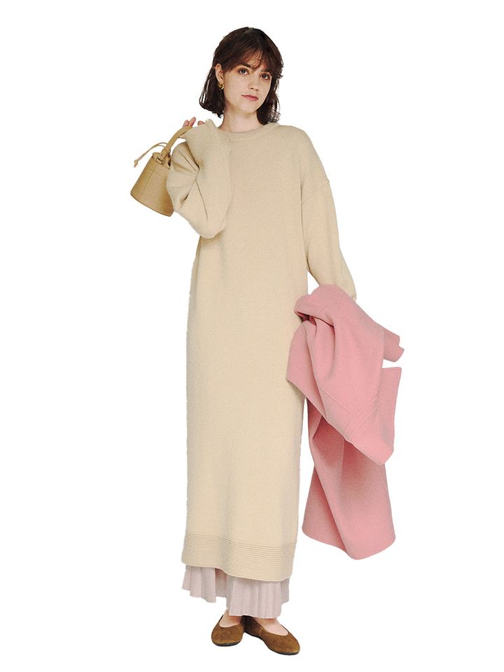 甘く転びがちなベージュワンピースは、ざっくりとしたラフな編み地と、ほどよい厚みを選択基準に。ゆったりとしたシルエットなら、体のラインを拾わないうえに、レイヤードするインナーで遊べるメリットも。編み目の粗さが切り替わるすそとそで口でメリハリもつく見た目。