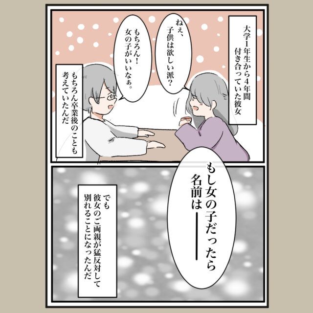 大学1年生から4年生まで付き合っていた彼女、叶絵さんとは、卒業後のことも考えていたというご主人、叶絵さんのご両親に猛反対されて別れることになったものの、「子どもがもし女の子だったら名前は・・」と将来のことも話していました。
