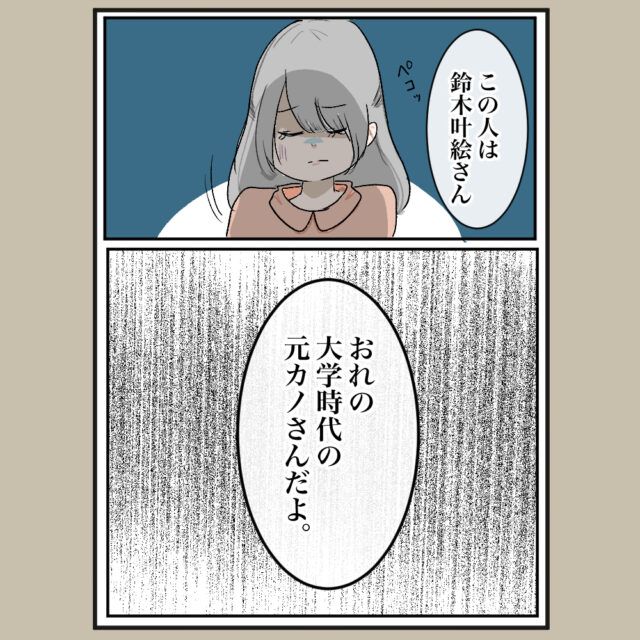 すると、「この人は鈴木叶絵さん、俺の大学時代の元カノさんだよ」ご主人が紹介した女性は、自己紹介の時、驚いていた女性でした。