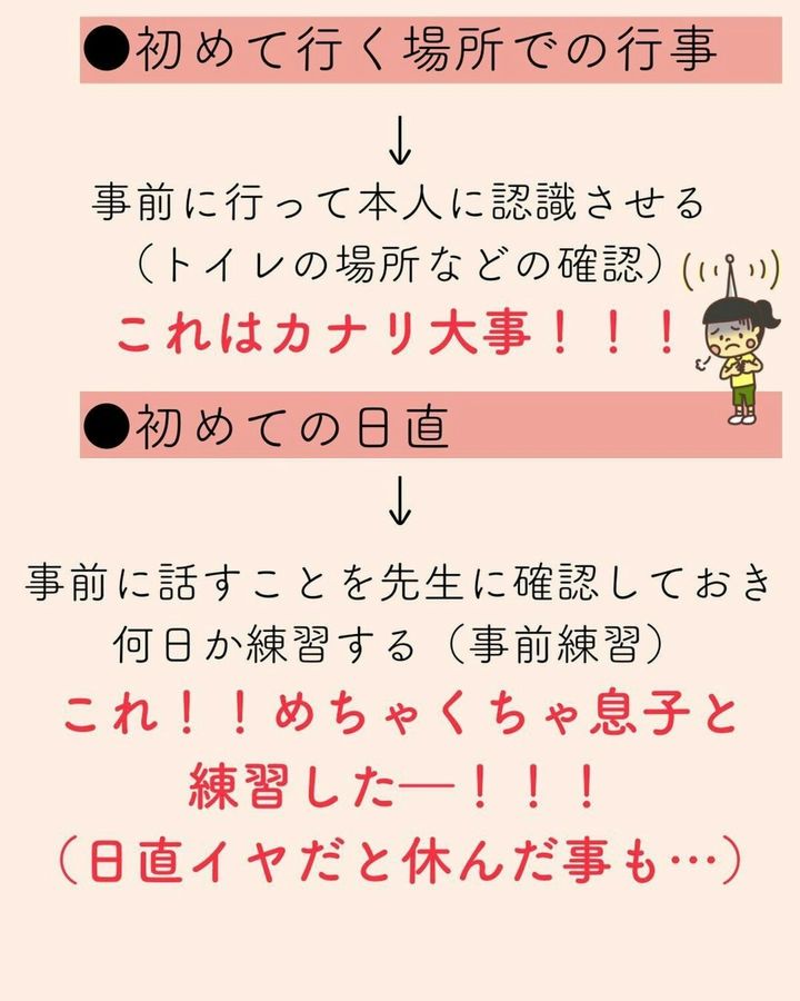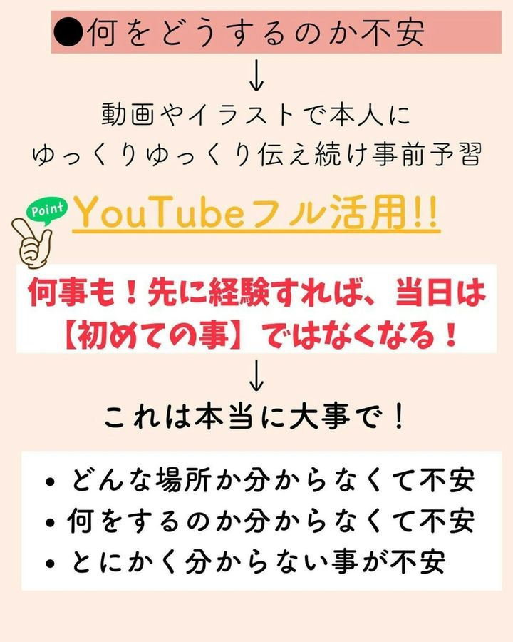 親の理解で、子どもの「不安と負担」はかなり減っていきます。事前準備や場所に連れていくことは、親の負担にはなりますが、この先のことを考えるととても必要なことです。