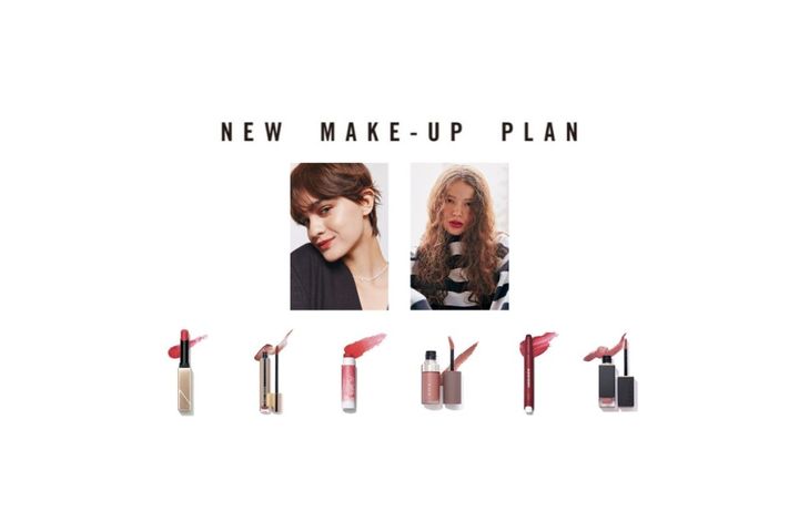 ツヤも発色もほどよい、リップバーム感覚でつかえるナーズのリップを、ラフに直塗り。中央に少しだけ重ねてぷっくりとした印象に。リップを主役にしたいから、目元はヌードカラーのマットを選んで、主張を引き算。