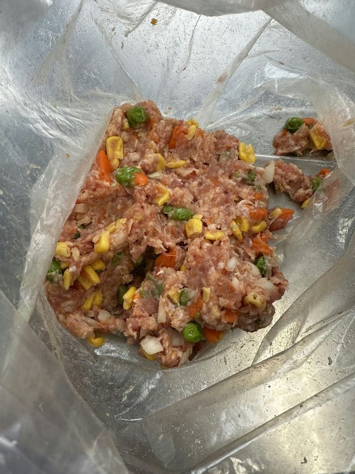 1 ミックスベジタブルは下茹でし、水気をとります。チーズは適度にカットし、チーズ以外の材料を全て袋に入れ揉んでおきます。