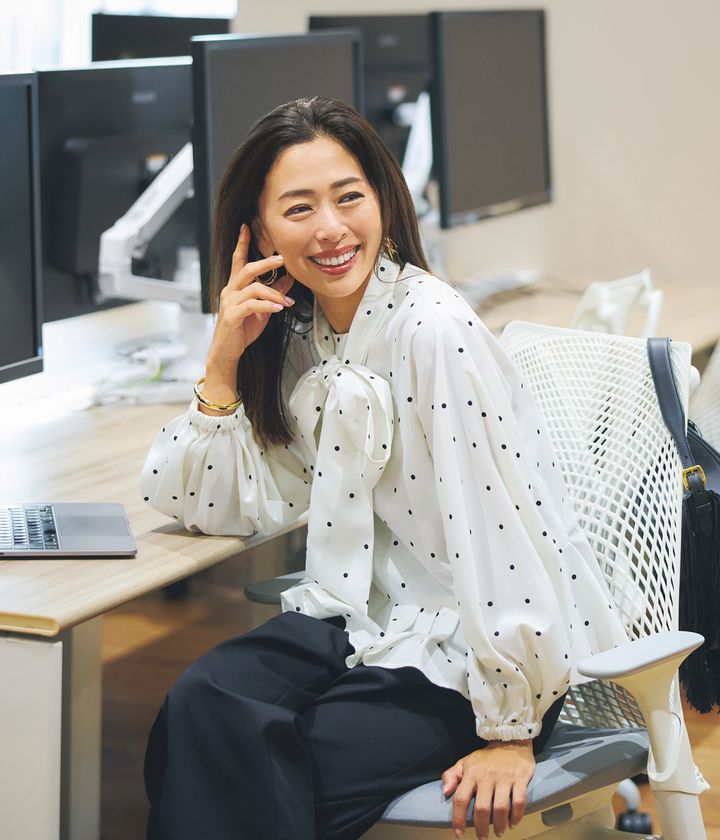 「耳を傾けるけれど、媚びない」…そんな時代のお仕事着は話のきっかけになる「盛りアイテム」と、安心感を与える「シンプルアイテム」を組合わせて。座っていても目を引く華やかなリボンタイブラウスにベーシックなタックパンツで“理想の先輩”を演出。