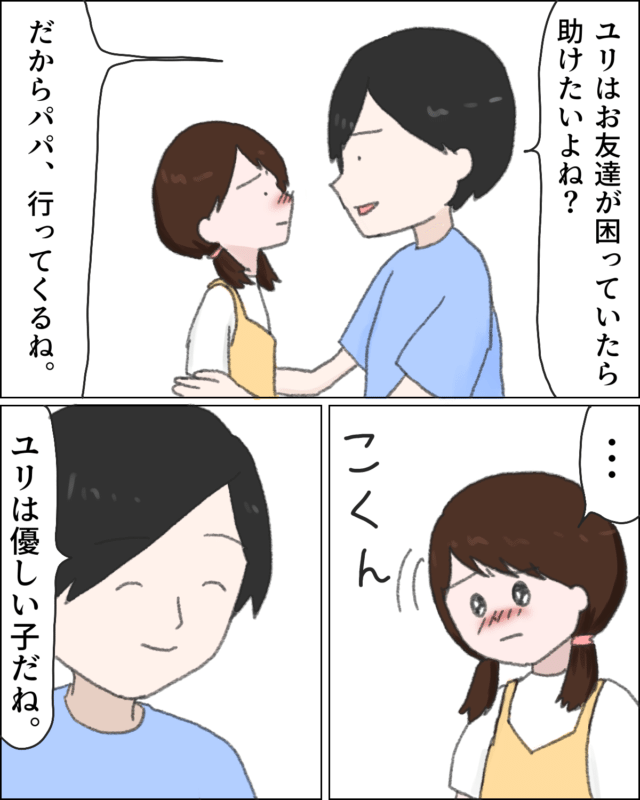 「ユリはお友達が困っていたら助けたいよね?だからパパ行ってくるね」と、夫はユリに言いました。そんなのユリの優しさに付け込んだ残酷な言い方だと思いました。