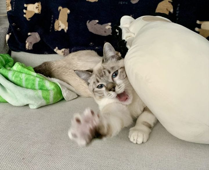 おててを伸ばし、口を開けているネコ。 その姿が、パニック映画やホラー映画のワンシーンを彷彿させると話題になっています。