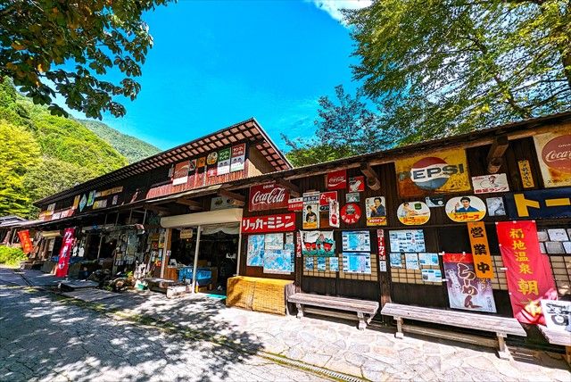 レトロな外観が特徴の「福地温泉朝市」は、地元の食材や工芸品のほかにメンコやベーゴマ、かつての映画ポスターなど、懐かしさを感じる商品がズラリと並ぶスポット。