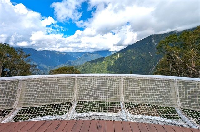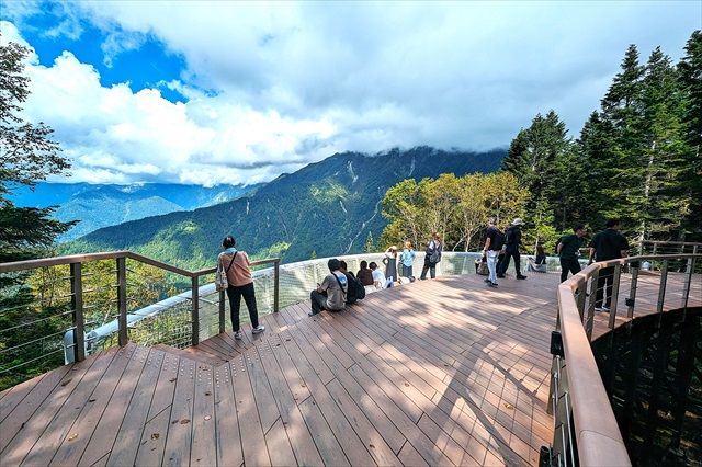 先駆けてオープンした「槍の回廊」はすでに大人気のスポットに。傾斜から張り出したようなデッキは標高約2,000mの高さで、目の前に広がる北アルプスの山々は圧巻の景色。先端部分はネットになっていて立ち入りもOK! ドキドキの体験を楽しんで!
