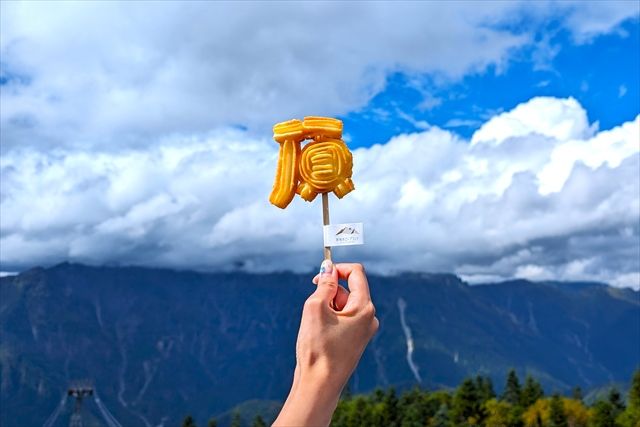 西穂高口駅へ訪れたら、駅内の喫茶店「マウントビュー」で映えグルメを買うのを忘れずに! “頂”の文字の形をした「頂チュロス(税込 510円)」は写真映えバツグン! 展望台で雄大な山々をバックにして写真に収めましょう。