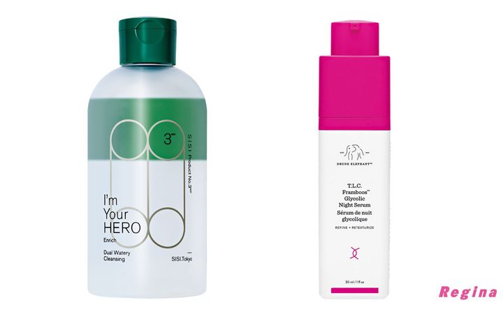 左/「アイムユアヒーロー エンリッチ」230mL ¥3,980(SISI)、右/「ティーエルシー フランブース グリコリック ナイトセラム」30mL ¥13,310(ドランク エレファント)
