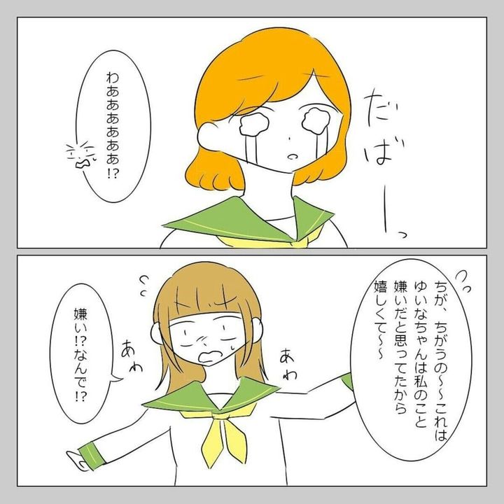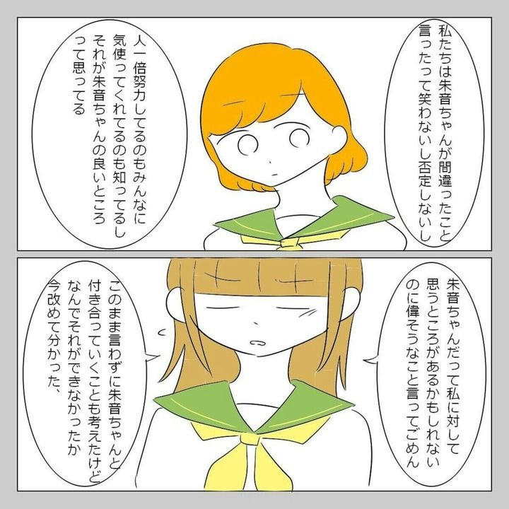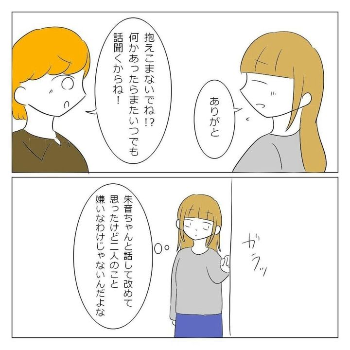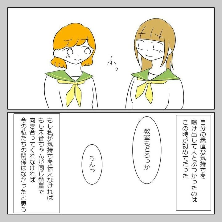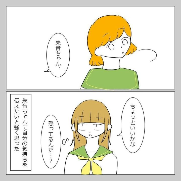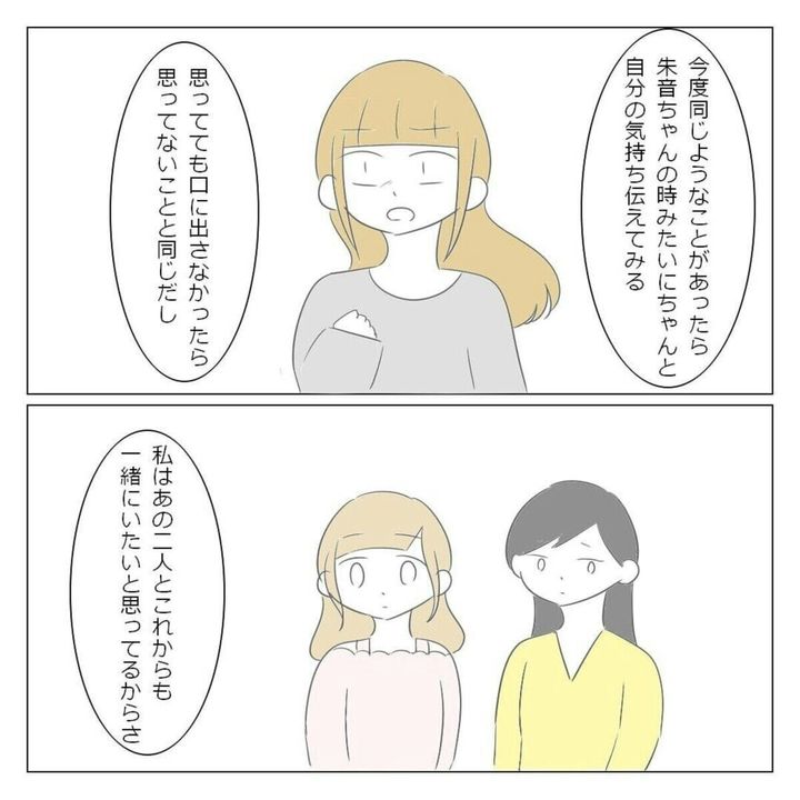初めて、自分の思ったことをさらけだして話をした ゆいな。すると、真剣な気持ちが伝わったようで、朱音は素直に聞き入れてくれました。このできごとがきっかけで、2人の仲は深まります。朱音は気持ちを伝えたゆいなに感謝していました。