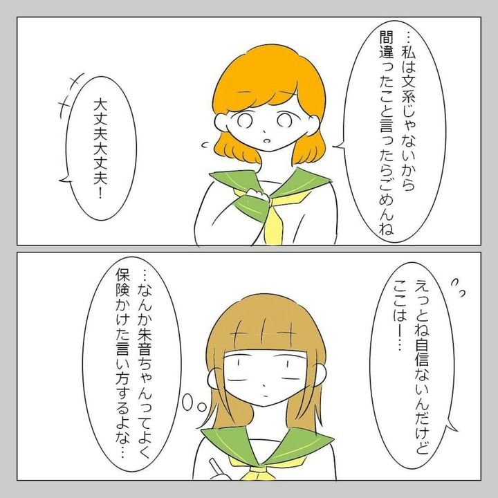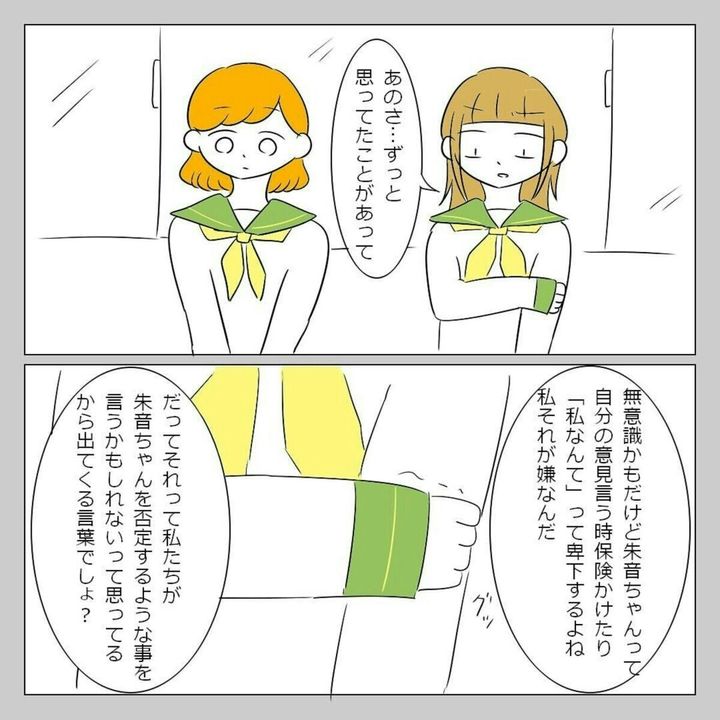 高校生のとき、仲良し4人グループで行動していた主人公・ゆいな。このとき出会ったのが朱音でした。事あるごとに、保険をかけるような言い方をする朱音のことが気になっています。今までは、他人の言動について気にしたことがありませんでしたが、なぜか朱音のことが気になります。