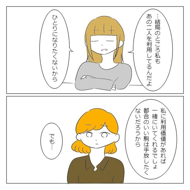 今の美姫・華との関係性に悩み、思い切って別の友人・朱音に打ち明けました。すると朱音は、自分のことにように考え、心から ゆいなのことを心配してくれます。ですが、「利用しているのはお互い様」と考える面もあるゆいな。そして改めて、2人といる自分を客観的にとらえることができました。