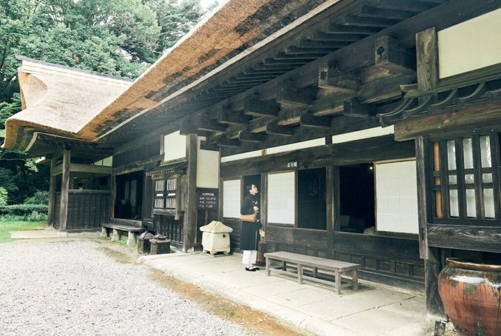 民芸の世界をもっと知りたくなって栃木・益子へ。『濱田庄司記念益子参考館』は陶芸家・濱田庄司の作品や彼が世界各地から収集した工芸品を収蔵する施設が、広大な敷地に点在している美術館。館内の最奥に佇む4号館は、この6月に茅葺き屋根の修復を終えたばかりの庄屋建築。濱田庄司も気に入っていたという迫力のある姿に圧倒される。 栃木県芳賀郡益子町益子3388 0285‒72‒5300 9:30~17:00 月休 ニットとデニムパンツは3、バッグはp.11、ダッフルコートとマフラーはp.13で紹介。その他スタイリスト私物