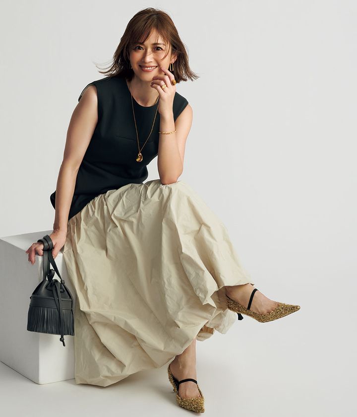 パンプス[H5㎝]¥42,900(PIPPICHIC/ベイジュ)ワンピース¥37,400(プランクプロジェクト/プランクプロジェクト 青山店)バッグ¥126,500(J&M デヴィッドソン/J&M デヴィッドソン カスタマーセンター)ピアス¥55,000(モニス/フォーティーン ショールーム)ネックレス¥55,000(リューク)ブレスレット¥56,100(O-KI/ロードス)リング[左手人さし指]¥341,000リング[右手薬指]¥149,600リング[左手薬指]¥605,000(すべてマリハ)